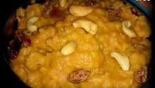 Apple Halwa is a mouth-watering Dessert. This tasty Sweet is prepared with grated Apples, Khoya, Sugar, Cashew nuts, Raisins and Ghee. Click the Image of the delicious Apple Halwa, to know the simple procedure to prepare it at home and relish its taste.